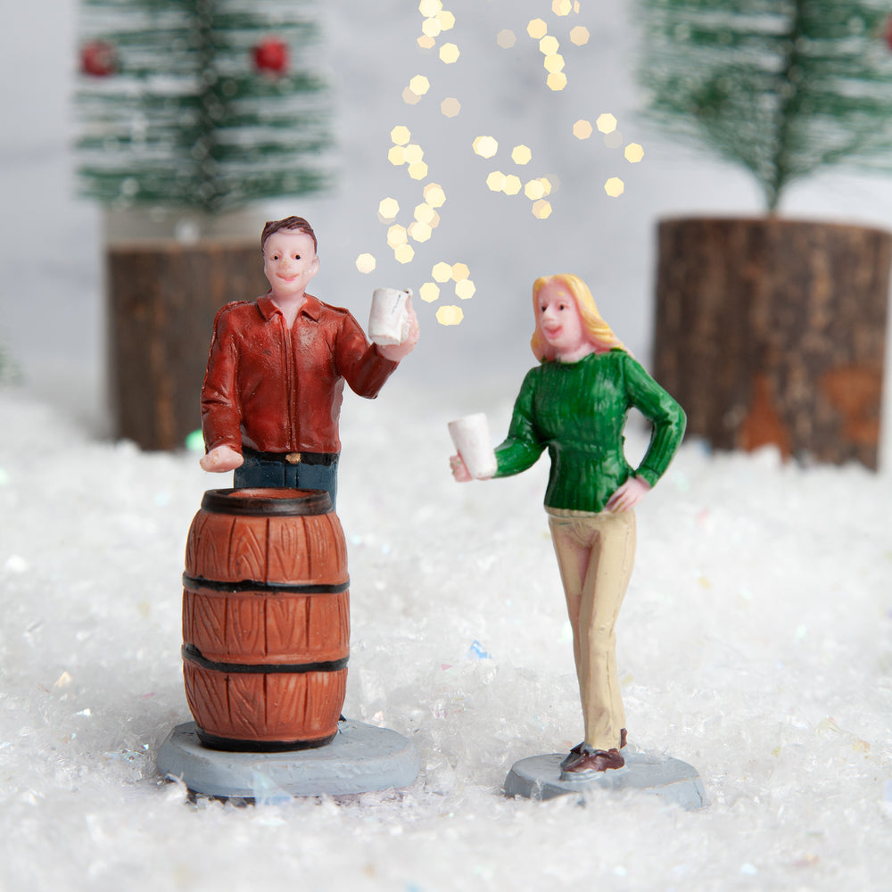 Beautifully painted figurines enjoying a festive drink. A stunning addition to any miniature village that is sure to add character.