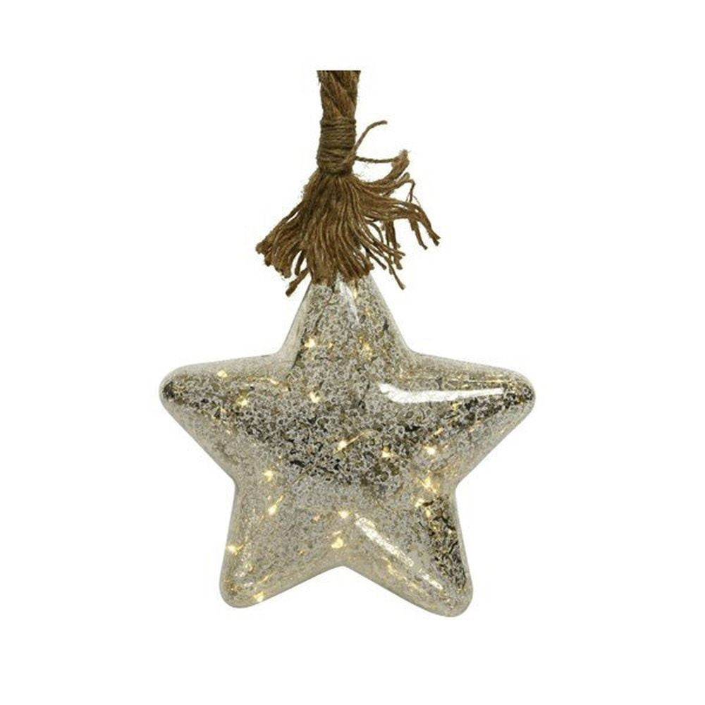 Micro LED lights in glass star with a smoky finish on a rope stem. 20cm tall with 100cm of rope for hanging. Battery operated requiring 3x AA batteries for approximat... Read more