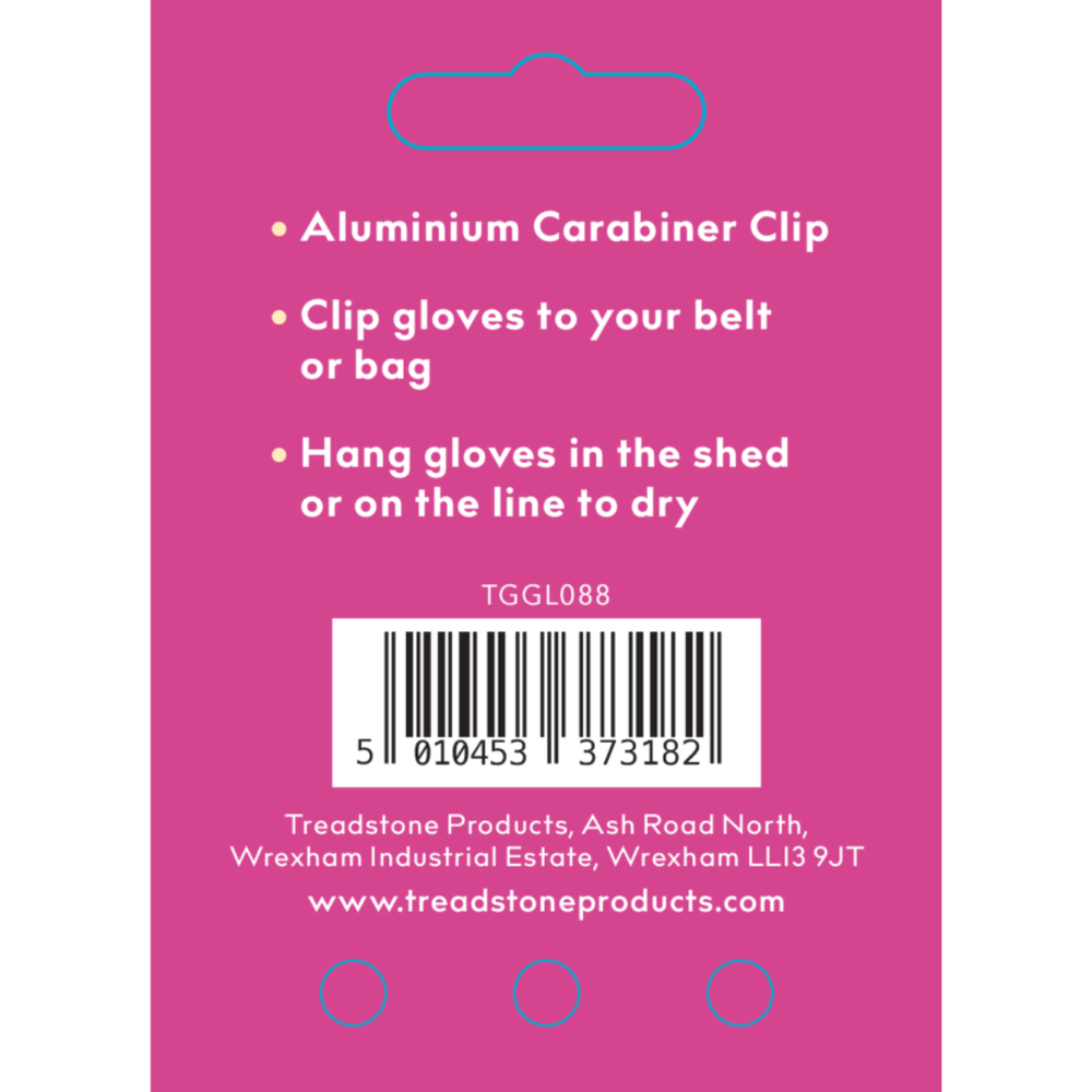 Aluminium Caribiner clip. Clip gloves to your belt or bag. Hang gloves in the shed or on the line to dry. Read more